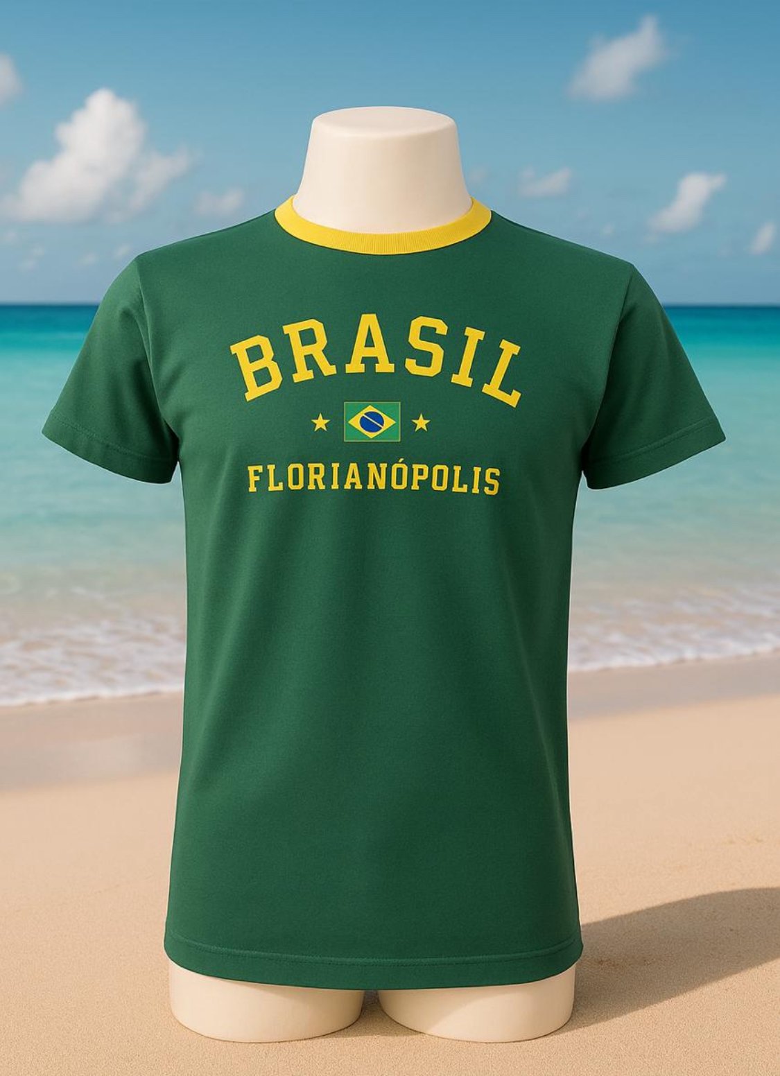 Mostre sua paixão pelo Brasil com essa camiseta masculina estampada, na cor verde com gola amarela e estampa central “Brasil Florianópolis”. Ideal para eventos, passeios ou presentear, essa peça combina conforto, estilo e identidade brasileira.